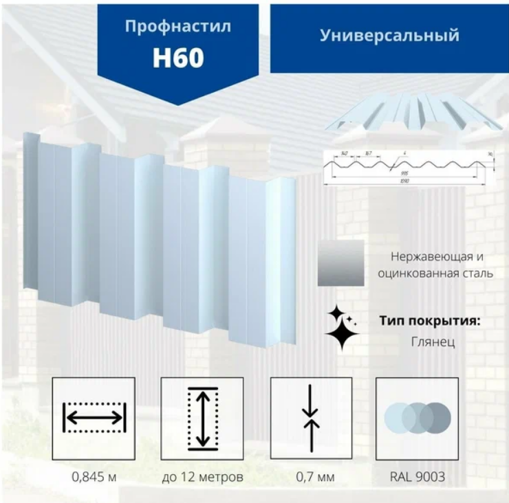 Профнастил Н60 RAL 9003 0,7х845/902 — универсальный материал для строительства кровли и ограждений.